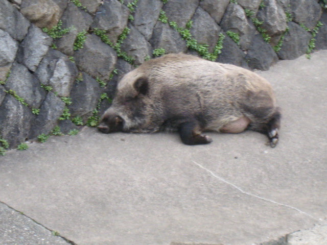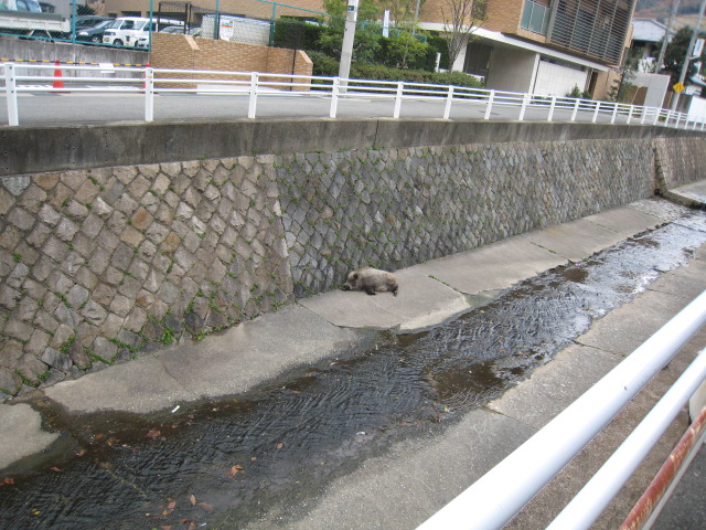 寝坊なイノシシ 風船 公開日: 2011年12月12日 カテゴリー: 日記 ■ もう土曜日になってしまいました。 また、神戸市東灘区の阪急岡本駅のそばの川(たぶん天井川という川)を 朝10時頃に通りかかりました。 ちょっと覗いてみると、イノシシがいます。 「あれ~、ひょっとして死んでるのかなぁ」と思っていましたが、 かすかに動いています。 たぶん、朝寝坊なんでしょうね。 川は、こんな状況です。 (川の向こう岸 中央に小さく見えるのがイノシシです)