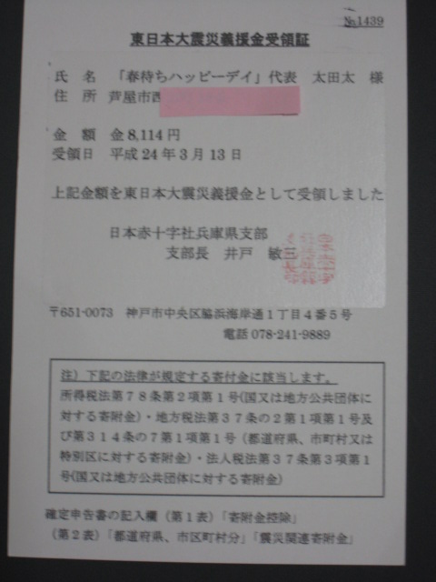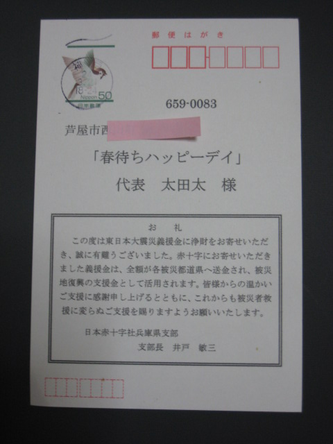 義援金受領証が送付されてきました。 風船 公開日: 2012年4月8日 カテゴリー: 日記 ■ 3月11日(日)に行った「春待ち ハッピーデイ」の義援金を振り込んで もらった時に、私の住所を書いていただきました。 そうしたら、先日 「東日本大震災義援金受領証」というハガキが到着しました。 (ハガキの表) ↓ こんなのがいただけるんだ! (知らなかった) でも、少額でも郵送するって、それだけでも手間がかかってしまいますね。 (被災地がどんどん復興することを願っています。) (ハガキの裏) ↓