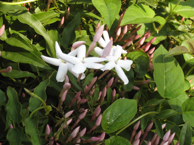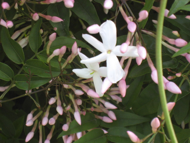 羽衣ジャスミンの季節到来! 風船 公開日: 2012年5月5日 カテゴリー: エンジョイ・ライフ、ブログ、日記 ■ 今年も、羽衣ジャスミンの花が咲き始めました。 例年より、ちょっぴり遅いように思います。 しかも、いつもと同じで、サザンカの木を覆い尽くしています。 あまりに覆い尽くしているので、サザンカが可哀想なぐらいです。 でも、ジャスミンの花の甘い香りを楽しみにしているので、 ジャスミンを切れずにいます。 細長い白っぽいピンクのものが、すべてジャスミンの蕾です。 一度に咲くと、あまりの甘ったるい香りに、頭がクラクラするので、 少しずつ長く咲いてくれると嬉しいです! 明日(日)の12:35頃がまん丸の満月。 今日・明日の満月には、ジャスミンの香りは、まだ少なそうです! (^。^)