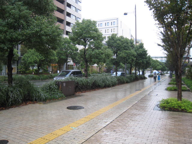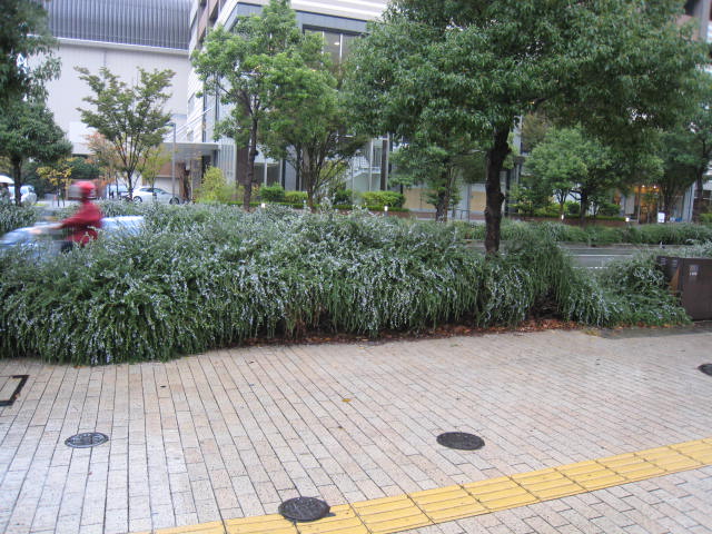 道路の両側の歩道に植えられたのローズマリーが、雨に打たれながら