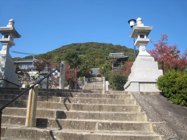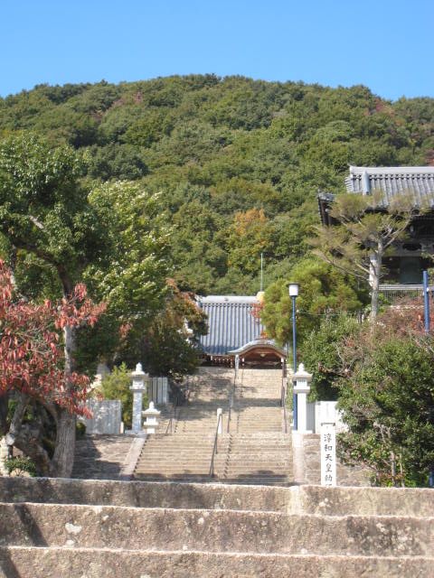 (カブト山をバックに、中央に低く見える神呪寺の屋根、右は鐘楼。 石段下から)