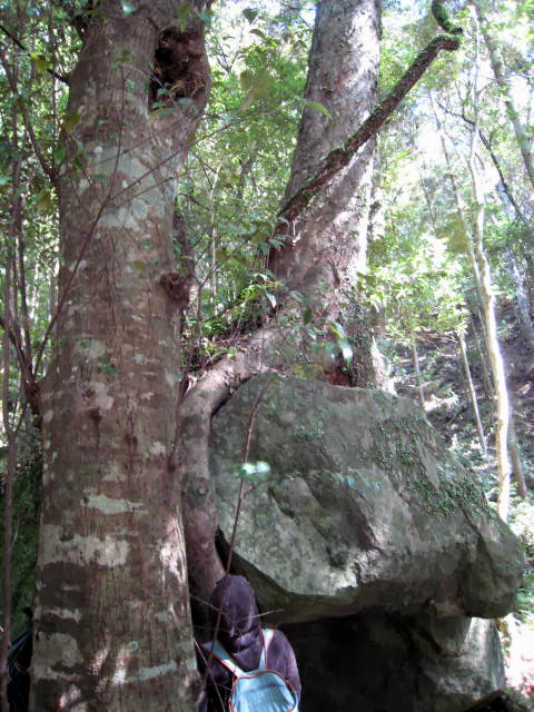 (歩き始めてすぐに、こんな岩を抱えた木も)