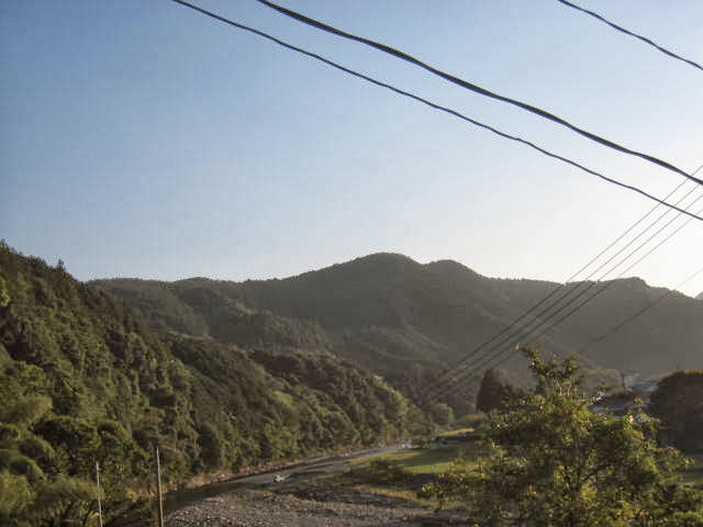 (熊野古道 中辺路 歩き始めは、中央の2つのコブのような山から)