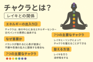 ヨガやヒーリングでよく耳にする「チャクラ」は、レイキとも深い関係があります。 チャクラとは、私たちの身体にある エネルギーセンター(エネルギーの出入り口) のこと。 チャクラは、生命エネルギー(プラーナ・気・氣) が体をめぐる重要なルート上にあり、 逆に、いずれかのチャクラが閉じたり過剰に活性化すると、心身の不調や感情の乱れにつながると言われます。 レイキヒーリングでチャクラのエネルギーを整えると、レイキのヒーリング効果はさらに高まると考えられています。 初心者でも、レイキを通じてチャクラのバランスを感じ取り、整えることが可能です。 ※チャクラの数や位置には諸説あります。 チャクラの理解は、レイキヒーリングをより効果的にします。 「チャクラとは何か」を知ることは、自分自身を知る第一歩。